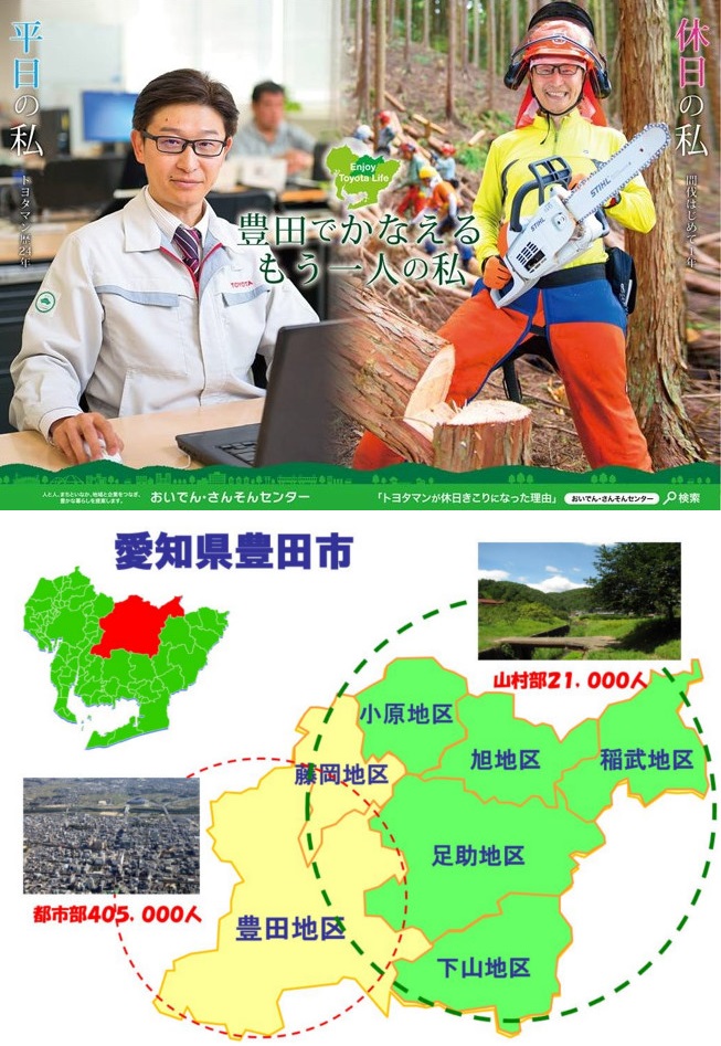 上/「平日はトヨタ自動車の社員、休日は間伐のボランティア」。実際の市民を取り上げたこのポスターで『おいでん・さんそんセンター』の取り組みを明確に表現。下/豊田市では人口42万人のうち、40万人が都市部に集中愛知県豊田市は、言わずと知れたトヨタ自動車のおひざ元。クルマ産業のまちというイメージが強いが、2005年の大合併で足助町や小原村といった町村が加わり、森林が約68%を占めている。