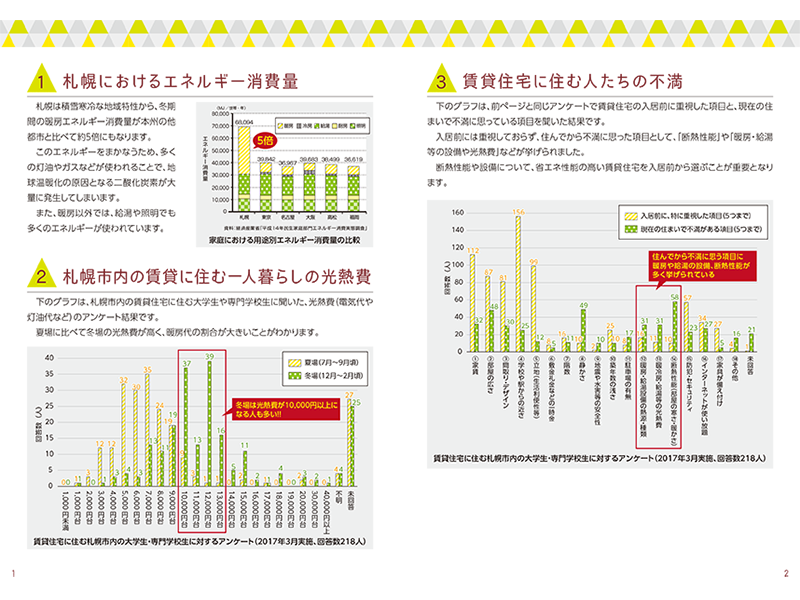 札幌は道外から大学進学で転入する学生が多く、冬の光熱費が大きな負担になる特徴があった。そこで2017年3月に市内の6大学と3専門学校でアンケートを実施し、218件の回答を得た。そこで浮かび上がったのは、入居前に断熱や省エネの性能を重視している人は少ない半面、入居後に部屋の寒さや光熱水費の高さを知り、それらに不満を持つ人が多いことだった。入居前に特に重視した項目は、「学校や駅からの近さ」が最多の約72%で、「暖房・給湯等の光熱費」「断熱性能(部屋の寒さ・暖かさ)」はともに約5%にとどまった。また居住者の4割が光熱費を節約するため意識して省エネ行動をしておらず、冬場の光熱費は夏場の約2倍だった。