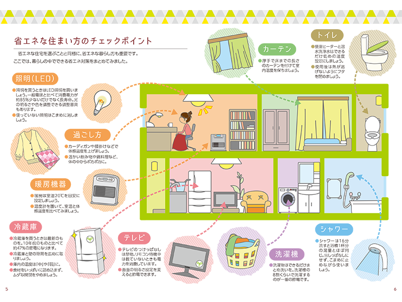 「暮らし方」に関しては、暖房器具や家電、生活用品の使い方のコツをまとめた。暖房は室温20度を目安に設定し、照明は一般電球より消費電力が約85%少ないLED照明を使うようアドバイス。室内温度を保つため、カーテンは厚手で床までの長さがあるものを選び、トイレの便座ヒーターと温水洗浄水はできるだけ低めの温度に設定し、熱が逃げないように使用後は便座の蓋を閉めることを勧めた。冷蔵庫は最新のものだと10年前の製品より約47%の節電につながり、シャワーは16分流すと浴槽1杯分の湯量に相当する、といった豆知識も盛り込んだ。