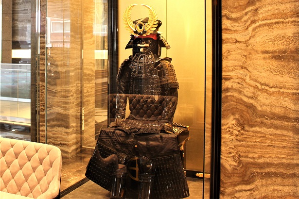 栄タワーヒルズの住居エントランスには、甲冑が飾られている。名古屋にゆかりがある、三英傑と呼ばれる織田信長、豊臣秀吉、徳川家康の甲冑のレプリカだ。中世ヨーロッパの内装の中に不思議なほど溶け込んでいるが、同社の社長いわく「異文化の共生を狙った」とのこと。