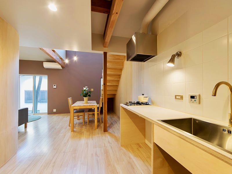 2階建てとはいえ、各住戸はロフトを入れて40m2前後と決して広くはない。そうした限られた空間であっても入居者が心地よく暮らせるよう、御手洗氏はさまざまな配慮をした。「それぞれの住戸の平面はL字型にしています。さらにその『L』の角部分を曲線にすることで、限られた空間に奥行きと変化を感じられるようにしました」と御手洗氏は説明する。また、各住戸のそれぞれ壁1面とそれに連続する天井面には色が塗られシンプルな部屋に個性を生んでいる。これは、各住戸の窓から見える木々から着想したもの。桜はピンク、モクレンなら紫というように、色を決めたのだという。