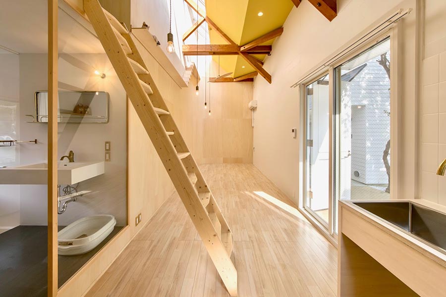 こうした多様な要件を備えた集合住宅を実現するため、2018年4月、木津氏はリノベーション設計に向け設計者のコンペを実施。家づくりの設計者や施工者を探すマッチングサイトで、広く公募した。20件余の応募から選ばれたのが、建築家、御手洗氏のプランだった。選ばれた最大の理由は、コンペで木津氏が提示した要件を満たしているだけでなく、もともと2階建ての建物に計4部屋あったアトリエ兼住宅を、メゾネットなど2階建ての住戸計6戸に変更したことだ。旧アトリエにはロフトを設け、旧居住棟は床を解体して吹き抜けにするというダイナミックな変更である。「猫がのびやかに3次元に動け、入居者にも空間が広く感じられ快適です」(木津さん)