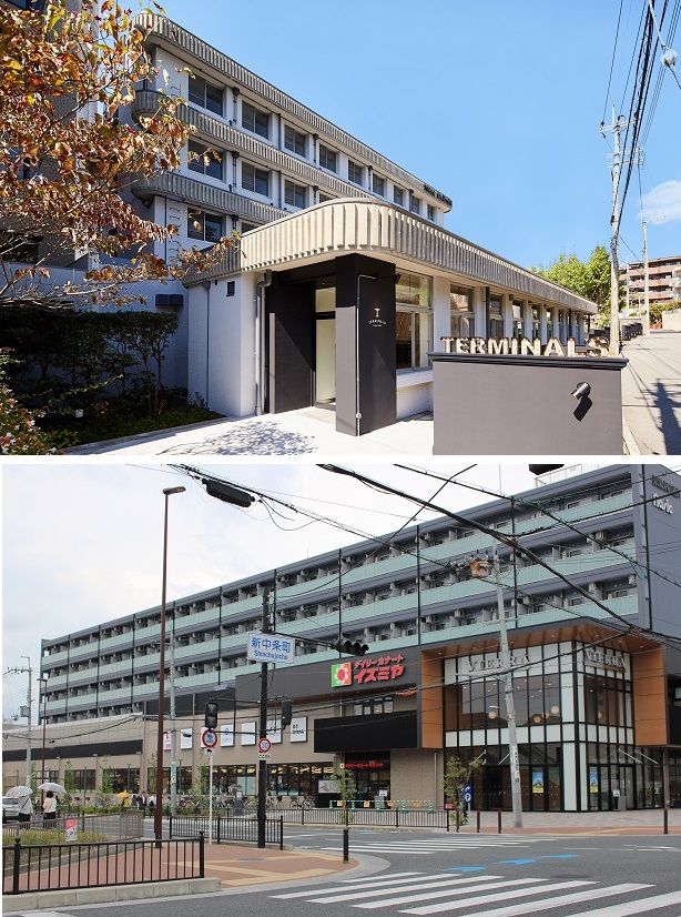 上/2018年10月にオープンした「TERMINALS高槻」<写真提供:グローバルエージェンツ>下/2019年6月にオープンした「TERMINALS茨木」。低層階はスーパーやクリニック、カフェなどの商業施設で、5・6階がソーシャルアパートメントとなる株式会社グローバルエージェンツが展開する「ソーシャルアパートメント」。1K、1DKなど従来型の部屋と、ラウンジなどの共用部を備え、住人間の交流を楽しめるアパート、マンションのことをいう。シェアハウスとも異なる、ソーシャルとプライベートを両立できる新しい居住スタイルとして、20代~30代を中心に人気を高めている。これまで当サイトでも原宿、神戸などの物件を紹介してきたが、2019年6月現在で首都圏、関西地区、北海道に43棟2,400戸と広がりを見せている。