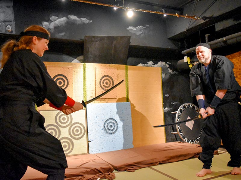 「修行」と題した体験プログラムは、送迎も含めて1回120分。歩き方の練習や、本物の武器を使った吹き矢や手裏剣投げ、殺陣などを、忍者装束をまとって楽しむことができる。修行のプロデュースには、伊賀忍者の子孫や、京都で忍者修行などの経歴を持つ、本格的な忍者たちが携わった。