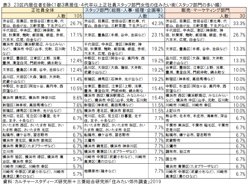 そこで23区内居住者を除く1都3県居住の4大卒以上正社員と、そのうちスタッフ部門女性の住みたい街を集計してみた。