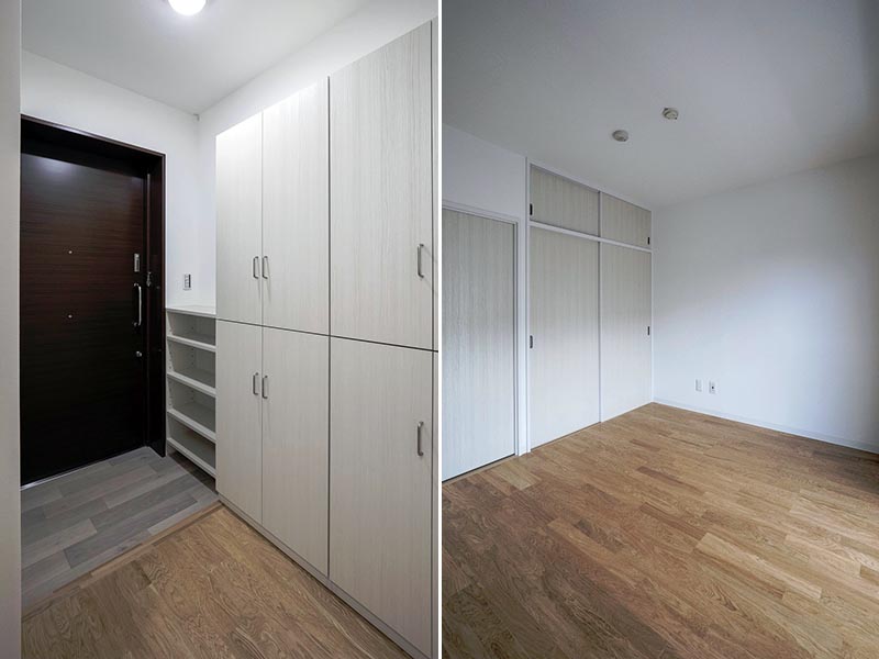 最後に住戸の感想を。もっとも魅力的なのは南向きの、明るい室内という点だろうか。人間も動物なので、陽光を浴びると気持ちが明るくなるし、目覚めもよくなる。健康な生活ができそうな部屋というわけだ。キッチンや水回りも新しくなっていて気持ちよい。全体の専有面積の割に広く感じたのはトイレ、脱衣所など。玄関に靴、衣類用と2カ所の収納があるのも目についた。室内の収納も天井までの高さの1間。だいぶ、入りそうである。