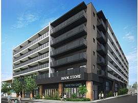 「この物件の一番の特徴は駅から2分でアプローチできる立地の良さ。屋根付きのルートを通れば雨に濡れずに駅に行けます。駅前にはスーパーやドラッグストア、レストラン、総合病院のサテライトクリニックなどが入った商業施設があるほか、1階にはTSUTAYAが展開するブックカフェを併設しています」と伊藤さん。