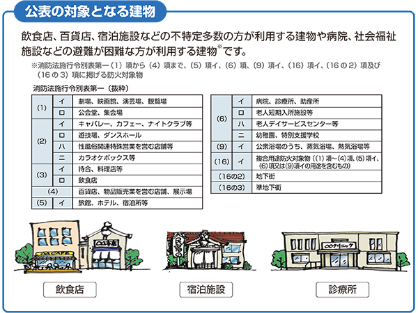 不特定多数の人が利用する飲食店、百貨店、宿泊施設や避難が困難な人が利用する病院、社会福祉施設など。