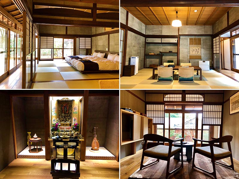 建物の広さは約176.16m2。キッチン、ダイニング、リビングの他に、居間・寝室兼用の2間続きの16畳の和室とサブの寝室がある。庭に面した縁側の廊下を伝って西側に回り込むと、不動明王像が安置された仏間があった。三井寺の霊性の象徴ともいえる、『和空三井寺』の心臓部だ。