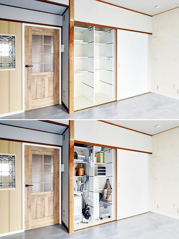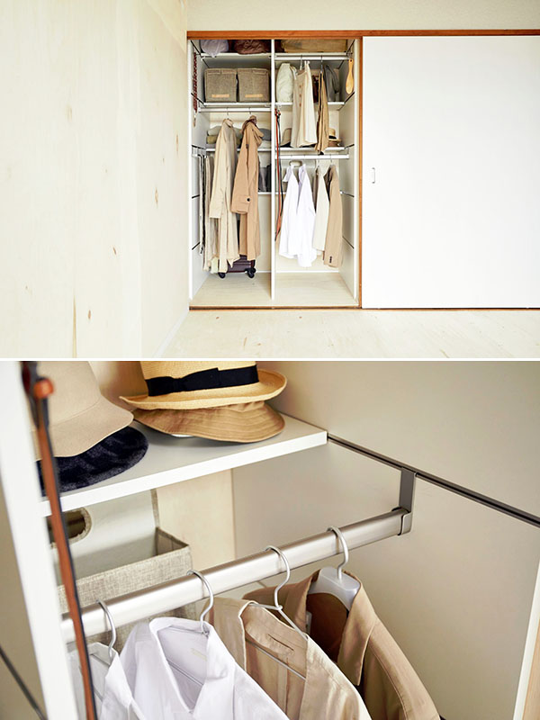 そこで賃貸住宅でよく行われてきた改修は中棚を外し、枕棚の下にポールを設置してクローゼットにするというもの。確かにコートなどは入るようになる。だが、それ以外のモノはどうすればいい? 私達の持ち物は衣類だけではなく、身に着けるモノだけでもバッグあり、ネクタイあり、アクセサリーなどの小物ありと実に多様な種類、サイズがある。もちろん、それ以外にも掃除機やアイロンその他、普段はしまっておきたい家電などもある。