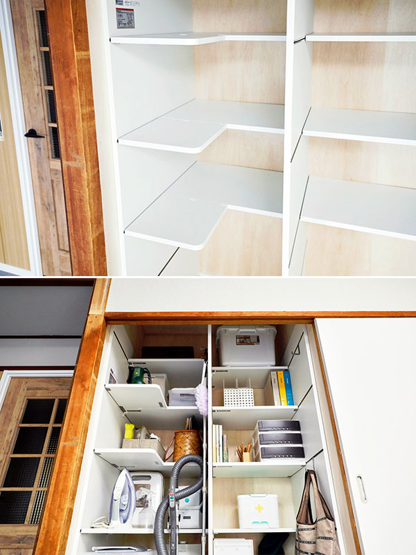 もうひとつ、なるほど!という発明がL字型に使える棚板。手前に人が入れるスペースができ、これを使えば半間の押入れが小さいながらもウォークインクロゼットになるのである。人が入る部分には棚板がないので、その分、モノを置けるスペースは少なくなるように思うかもしれないが、そこには掃除機やスーツケースなど高さのあるものを置けば良い。キャスター付きのワゴンを置くという手もあろう。