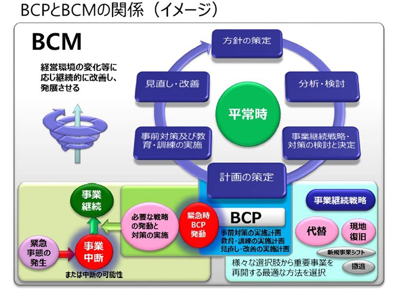 一方、BCMと呼ばれるものは「Business Continuity Management」の略。事業継続のためのマネージメントがBCMである。BCPが計画そのものであるのに対して、その計画を策定し、いざとなれば有効的に機能させるため、教育や見直し更新を繰り返していく企業行動そのものを示す。