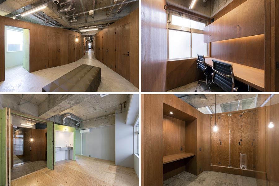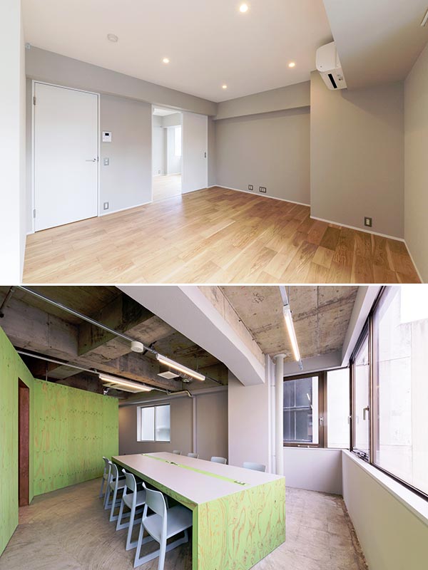 建物は1981年築の10階建て。4年前に、住宅を借りると階下のシェアオフィスを利用する権利が付いてくるという斬新な仕組みの物件「THE 6」を作った株式会社エコラが、都心部に次の一手をと考えて2年前に1棟をまるごと購入。ある程度の入居者が退居するのを待ってリノベーションした。南北に細長い建物は中央部の階段、トイレなどの共用部を介して1フロアが南北に分かれる形となっており、それぞれが25坪(82.5m2)ほど。使い方はフロアごと、南北でも異なっており、いずれも単一の用途ではない。