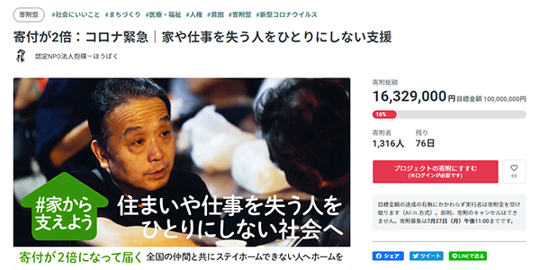 READYFOR「コロナ緊急|家や仕事を失う人をひとりにしない支援」プロジェクトページ