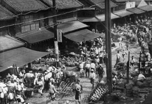 千住橋戸町にはやっちゃ場と呼ばれる青物市場があり、昭和初期は非常に繁栄していた。市場には荷主(近隣農家)が夜、牛に引かせた大八車に野菜を乗せて問屋に持ってきた。宿泊は問屋でして、翌朝競りを見て帰った。ついでに買い物をするための日用品店、食事をする飯屋、一休みする茶屋があった。茶屋には大八車を預けることができた。
