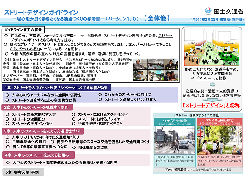 2020年3月30日、国土交通省は「ストリートデザイン」のガイドラインを公表した。副題は「居心地が良く歩きたくなる街路づくりの参考書」。同省が2017年頃から進めてきた、街路づくりについての調査や議論を集大成したものだ。19年8月に岸井隆幸日本大学特任教授を座長とする「ストリートデザイン懇談会」を設置、全7回の会合を経てガイドラインをまとめた。