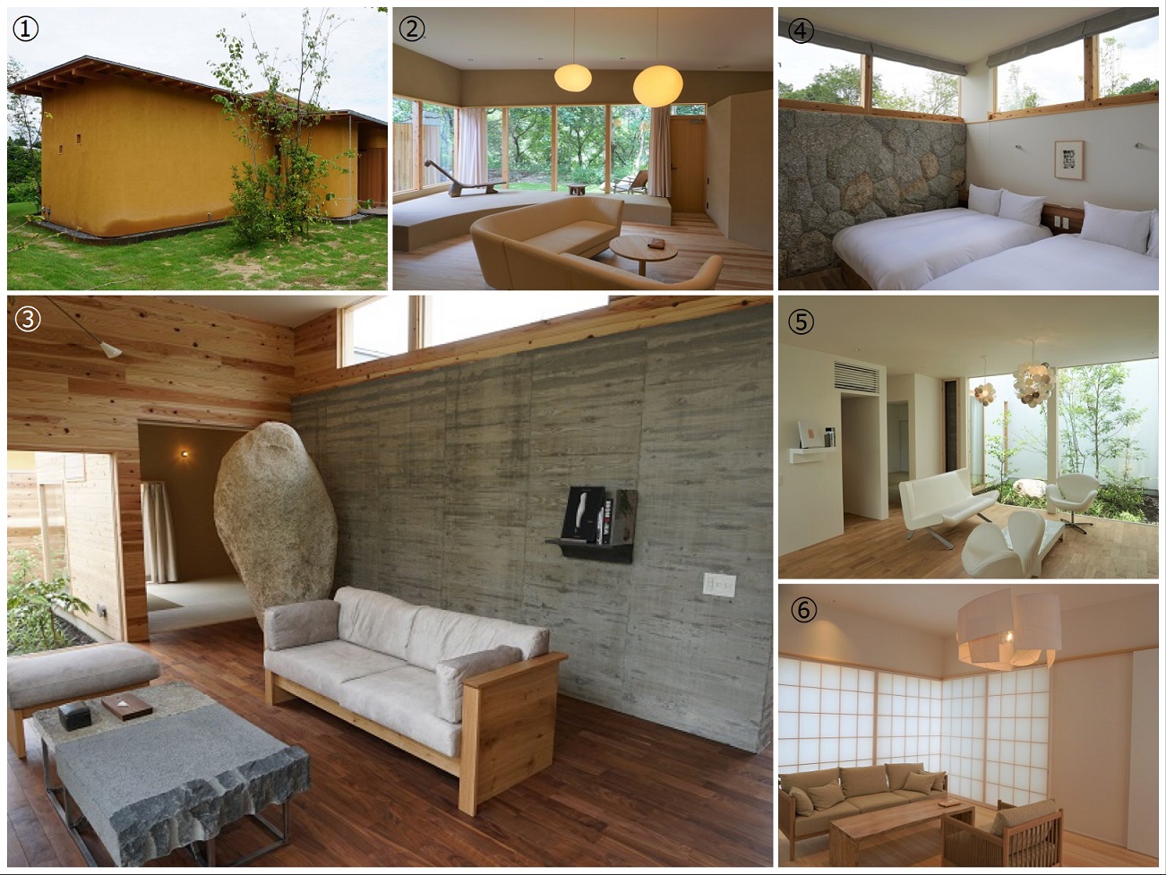 土を使ったヴィラは、「土逢(どおう)」と「囲土(いのつち)」と名付けられた2つ。「土逢」には茶人・千宗屋氏が監修した茶座敷・抱土(ほうど)がある。「土逢」の外観、「囲土」の外内観は、見事な丸みを帯びた土壁が見られる。