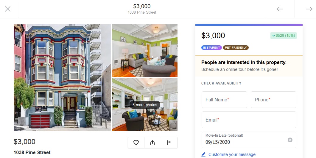 最後に「Zumper」でビクトリアンハウスが借りられないか、探してみた結果を。見つけたのはサンフランシスコの中心部に近い場所にある66m2ほどの1ベッドルームで賃料は3,000ドル。31万5,000円である。