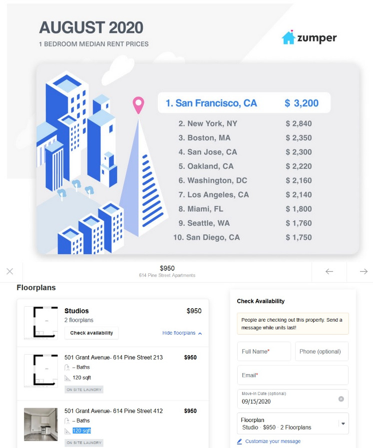 全米で家賃が高い10エリアのランキング。下は市内で950ドルで借りられる部屋Zumper National Rent Report: August 2020より