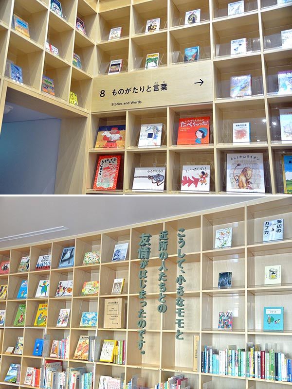 上/テーマごとに本が並ぶ。「ものがたりと言葉」では、古典やファンタジー長編、詩歌や俳句といった言葉の重みや繊細さを感じられるような本もセレクトされている 下/『モモ』(ミヒャエル・エンデ)の一文を使った“言葉の彫刻”本が並ぶ施設ということで図書館と誤解されるかもしれないが、ここはあくまでも文化施設。同館の館長・前川千陽さんによると展示方法に大きな違いがあるそうだ。