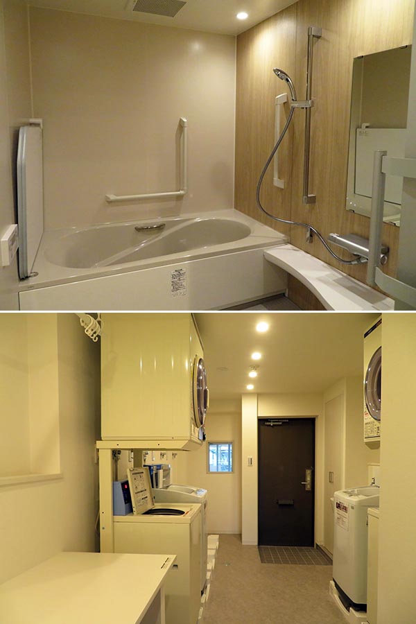 それ以外にも建物内には複数の共有の空間がある。たとえば1階にあるコモンバス。もともとは単身者向けの25m2の1Kが91戸ある建物だったため、各戸のバスルームはそれほど広くはない。一部、2戸を1戸にして広い部屋が作られているが、それでも子どもと一緒にゆったり入るほどではない。そこで1620の大きなバスタブのある部屋を作り、入居者全員が自由に利用できるようにしてあるのだ(1時間300円)。この部屋にはもうひとつ、コインランドリー(1回200円)も設置されている。社員寮だったので各室には洗濯機置き場がなかったのだ。