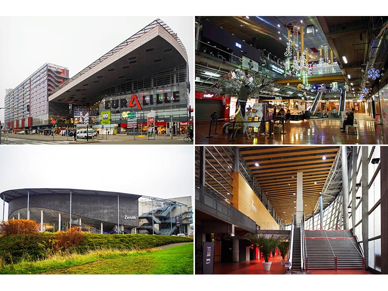 造形美のポルザンパルクに対し、同じフランスのジャン・ヌーヴェルは、人間の五感に訴えるような建築が特徴だ。「ユーラリール・センター」(下の写真)は、ユーラリール駅と旧リール駅(リール・フランドル駅)を結ぶ巨大な複合施設で、ショッピングモールをはじめとした商業施設のほか、オフィスや住宅、文化施設などが包含されている。