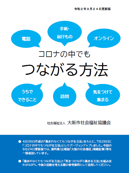 つながりを途切れさせることなく、お互いの暮らしを気にかけ合うにはどうしたらいいだろうか。その考え方を指し示す必要性を感じたことから、大阪市社協は、ボランティアや職員を読み手として想定した冊子「集まれなくてもつながる方法」を4月30日に、さらにこれをベースに追加収録・更新をした「コロナの中でもつながる方法」を7月28日に作成・公開した。