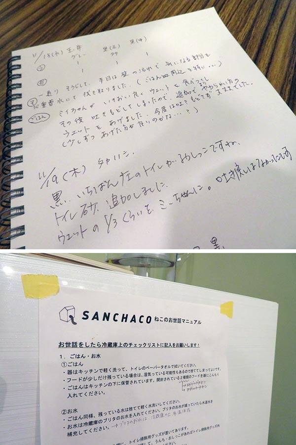 そんな意図もあり、猫の世話は入居者その他関わる人たちが順番に猫当番として担当する。共用スペースには猫のお世話マニュアルが掲示されており、猫の様子を観察、記録、気になることを引き継ぐための連絡帳も置かれている。