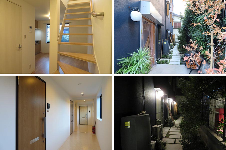 本題に戻ろう。建物は猫の健康に配慮して化学物質を使わない自然素材にこだわり、床には奥多摩の間伐材を使うなどしている。住居部分がメゾネットなのは縦方向の移動が好きな猫に配慮したもの。各住戸には、はちわれ、ちゃとらなど猫好きには受けそうな名称が付けられている。また、住戸脇の路地空間は三軒茶屋の古い写真などを参考に猫が居そうな裏路地空間を再現するべく造られたもの。1階部分の照明は提灯型で明かりがともるとなんともノスタルジックな雰囲気になる。入り口にある石畳の猫の足跡にもニヤリとさせられる。