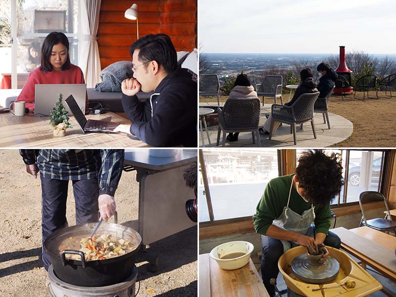 参加者たちは、室内や、室内から続くウッドデッキに設置されたこたつ、雄大な景色を望む野外のバーカウンターなど、思い思いの場所で仕事に取り組んだ。一見リラックスし過ぎるような環境だが、参加者の後藤有梨絵さん(情報通信業)は「里山の風景の中で、モチベーションをもって働けた」と話す。実際に体験することで、移住後の働くイメージを具体化することができそうだ。