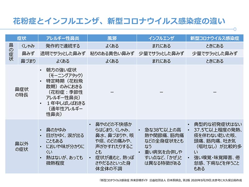 まずは花粉症とインフルエンザ、新型コロナウイルス感染症の違いについて大久保氏は、「新型コロナウイルスでも鼻づまりなどの鼻の症状が出ます。それぞれの違いは、花粉症はモーニングアタックという朝の強い症状があり、花粉が飛散する特定時期に起こる点で、新型コロナウイルスで特徴的なのは嗅覚・味覚障害が起こることです。花粉症の嗅覚障害は鼻づまりによって発生しますが、一方新型コロナウイルスは味覚・嗅覚の細胞に影響を及ぼしているために、においや味覚がおかしくなります。両方に共通する対策は手洗い・マスクの装着です。花粉症はだいたいのマスクで抑えられますが、コロナ禍においては医療用のマスクが有効なのではないか」と話した。