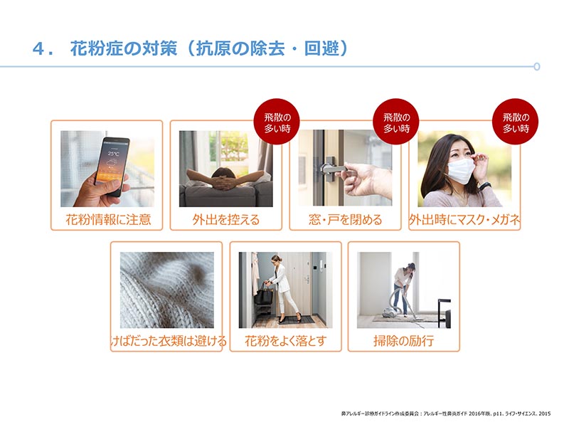 大久保氏はすぐにできる花粉症対策として、花粉情報をチェックする、外出を控える、窓・戸を閉める(多人数がいるときは開ける、網戸を閉める、薄いカーテンを閉めておくと花粉が入りにくくなる)、外出時にはマスク・メガネ(新型コロナウイルスにおいても目からエアロゾルが入ることが分かっているのでメガネは有効、目をかいてしまうことの予防にもなる)、けばだった衣類は避ける、花粉をよく落とす、掃除の励行(四隅によく花粉は落ちる)を挙げた。