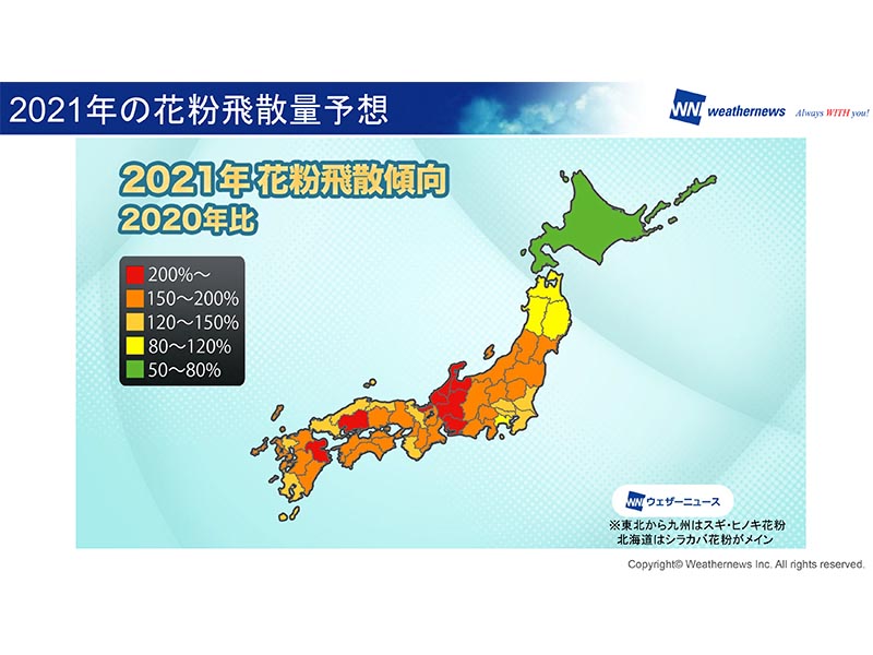 「2021年の花粉の飛散量は、昨年に比べて多い予想になっております。東北から九州にかけて昨年並み、もしくは昨年を上回る予想で、全国平均では2020年比で160%程度の予想。中部地方などは2倍以上のところもありますが、東京においては昨年比120%の予想です。予測した背景としては、2020年の夏の天候の状況が長い梅雨・記録的な多雨・8月の猛暑など極端な気象状況であり雄花の生育には好条件でなくやや不向きであったことが挙げられます。例年の平均と比較すると少ない傾向にはありますが、昨年よりも飛散量は多くなる予想ですので注意して過ごしていただきたい」と話した。