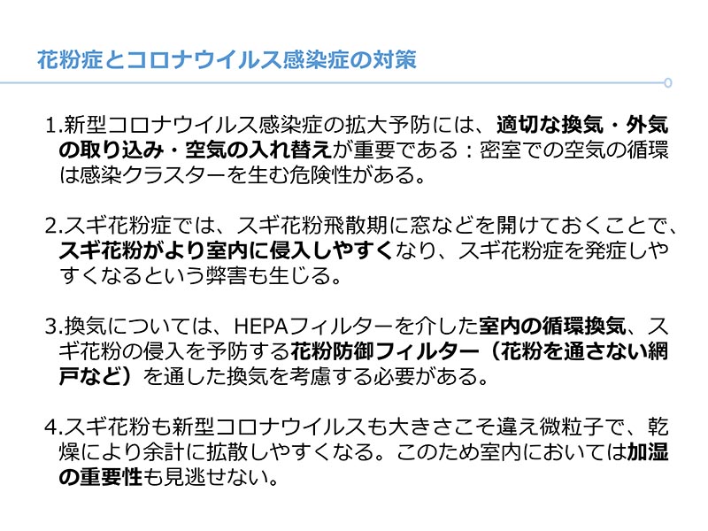 花粉症とコロナウイルス感染症の対策については「新型コロナウイルス感染症の拡大予防には、適切な換気・外気の取り込み・空気の入れ替えが重要です。しかし、スギ花粉が室内に入ってくるという弊害も生じます。HEPAフィルターを介した室内の循環換気や、スギ花粉の侵入を予防する花粉防御フィルター(花粉を通さない網戸など)を通した換気を考慮する必要があります。また空気を循環させるファンなどを利用してもいいかもしれません。スギ花粉も新型コロナウイルスも大きさこそ違えど微粒子で、乾燥により飛散しやすくなります。このため室内においては加湿の重要性も見逃せません。粘膜がしっとりして正常に機能しやすくなるので、寝室などに加湿器を置くのもよいでしょう」とのことだ。