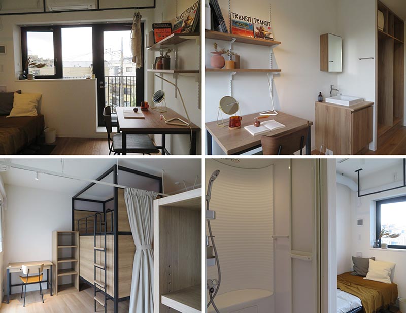 住戸は4~5階を除き、水回り共用の間取りとなっており、一人部屋で約9.8m2がメイン。全体として非常にコンパクトに作られており、バス・トイレ付きの一人部屋でも約13.0~14.7m2、4人部屋などの場合(新型コロナウイルスに配慮、当面は一人部屋のみ稼働予定。2人部屋、8人部屋もある)には2段ベッドの1段分とその前に置かれたデスクひとつが自分の空間ということになる。自室に籠るのではなく、他人と暮らす場と考えれば自室はコンパクトでよいということなのだろう。