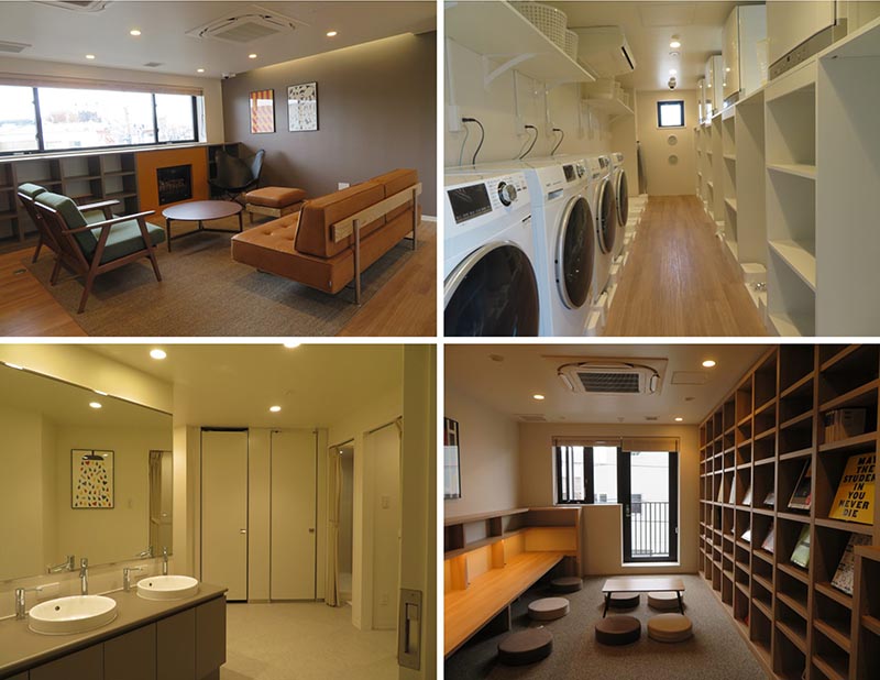 共有スペースとしては3階にコモンキッチン、ライブラリー、4階にコモンリビング、男女別のランドリー、5階にコモンキッチン、ルーフテラス、4~5階以外にはバスルームなどの水回りも用意されている。どの階でも建物中央に共有部を配し、そこから両側に住戸が広がる形になっており、効率よりも人の動線が交差することが意図されている。