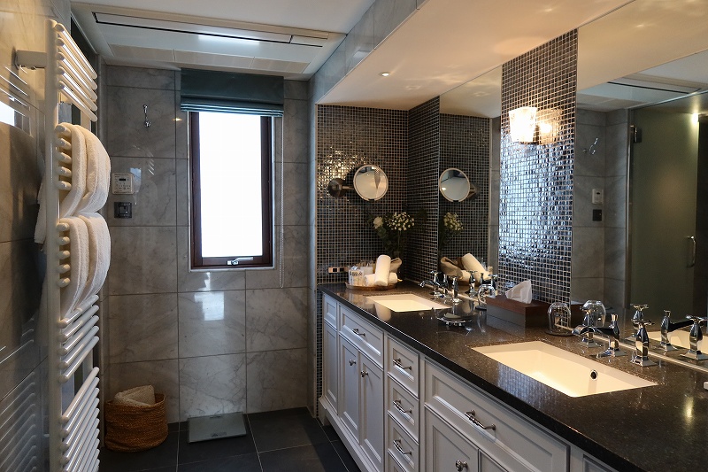 各部屋に共通する点についても説明しておこう。部屋の広さは40~45m2あり、それほど違いはないが、間取りや部屋の作りで感じ方はかなり異なる。基本は2人用ということで洗面台もダブルで用意されている。