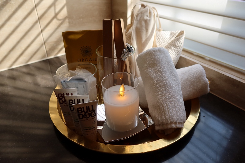 ホテルのテーマのひとつが「エコ&オーガニック」とのことで洗面所に置かれたアメニティも他とは一味違う。使い捨てではなく、竹の歯ブラシに木製のヘアブラシ、持ち手が竹のカミソリなど長く使える品が用意されているのである。使い心地にこだわったのはもちろん、持ち帰って長く使ってもらうことを意図した。せっかく、水の上に宿泊するのである、水がもっときれいになったらと環境について考えるきっかけになってほしいという気持ちもあるそうだ。