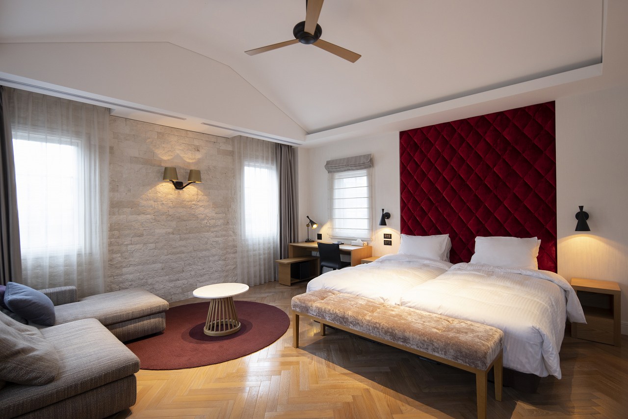 さて、最後の部屋は天井が高く、もっとも家に近い雰囲気。深い赤と白が基調の柔らかいインテリアでもあり、女性に人気とか。というのは他の部屋は定員2人なのに対し、この部屋だけは3人となっており、女子会利用が多いのだ。
