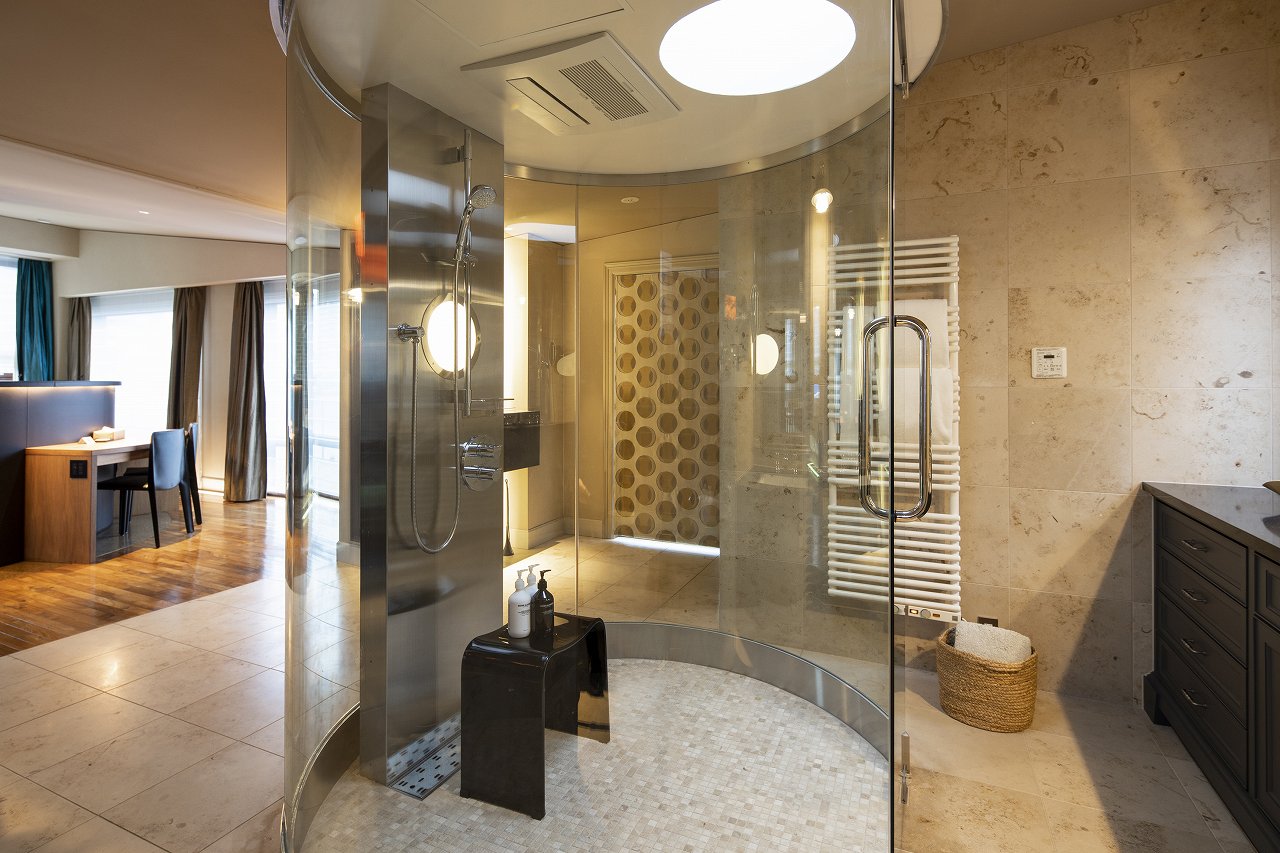 もうひとつ、この部屋ならではなのは円形で透明なシャワーブース。他の部屋は石張りのオーソドックスなスタイルになっているが、ここだけは部屋の中に設置されている。ただし、利用時はガラスが曇って内部が見えなくなるそうだ。