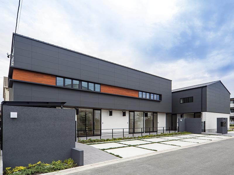 場所は、名鉄常滑線と河和線の乗換駅「太田川」駅からほど近い再開発エリア。近年では新しい商業施設や文化施設、大学キャンパスなども充実し、駅周辺は穏やかかつ整然とした街並みが広がっている。そんな街なかの住宅地にある公園を目前に立つのが、60m2のメゾネット7戸で構成される「classwork おおたがわ」だ。
