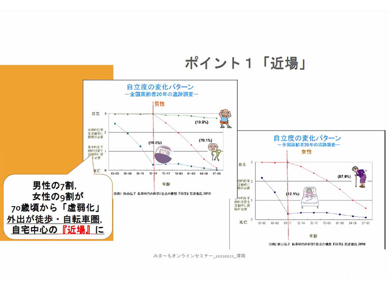 「男性の7割、女性の9割が70歳ごろから虚弱化(フレイル)が始まってきて、外出圏が近場になってきます。自宅中心の近場が生きる場になっていきますので近場でのつながりが特に重要になります」