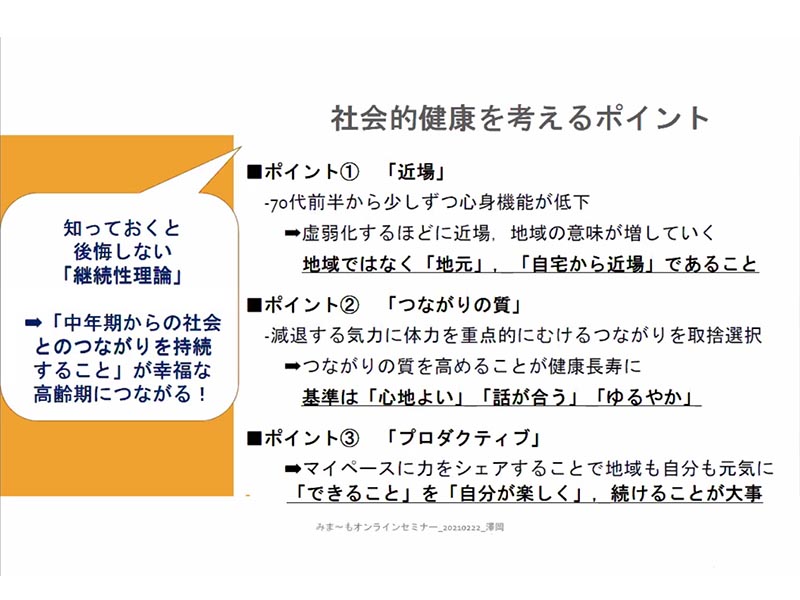 澤岡氏は、中年期から社会のつながりを持続することが幸福な高齢期につながると話す。ポイントは「近場」「つながりの質」「プロダクティブ」だ。