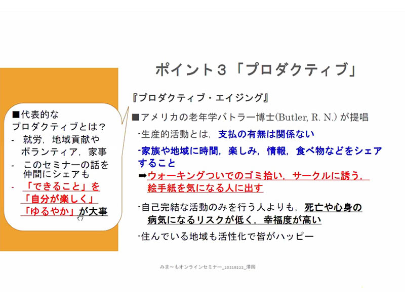 「先ほど奥井さんのお話にもありましたとおり、自己完結な行動のみでなく、自分は誰かのために役に立っていると感じられることも必要です。代表的なプロダクティブは就労、地域貢献、ボランティア、家事などです。どんな小さな行動でもいいので、周囲の人に情報をシェアする、発信するなど、できることを自分が楽しくゆるやかに続けていくことが大事です」