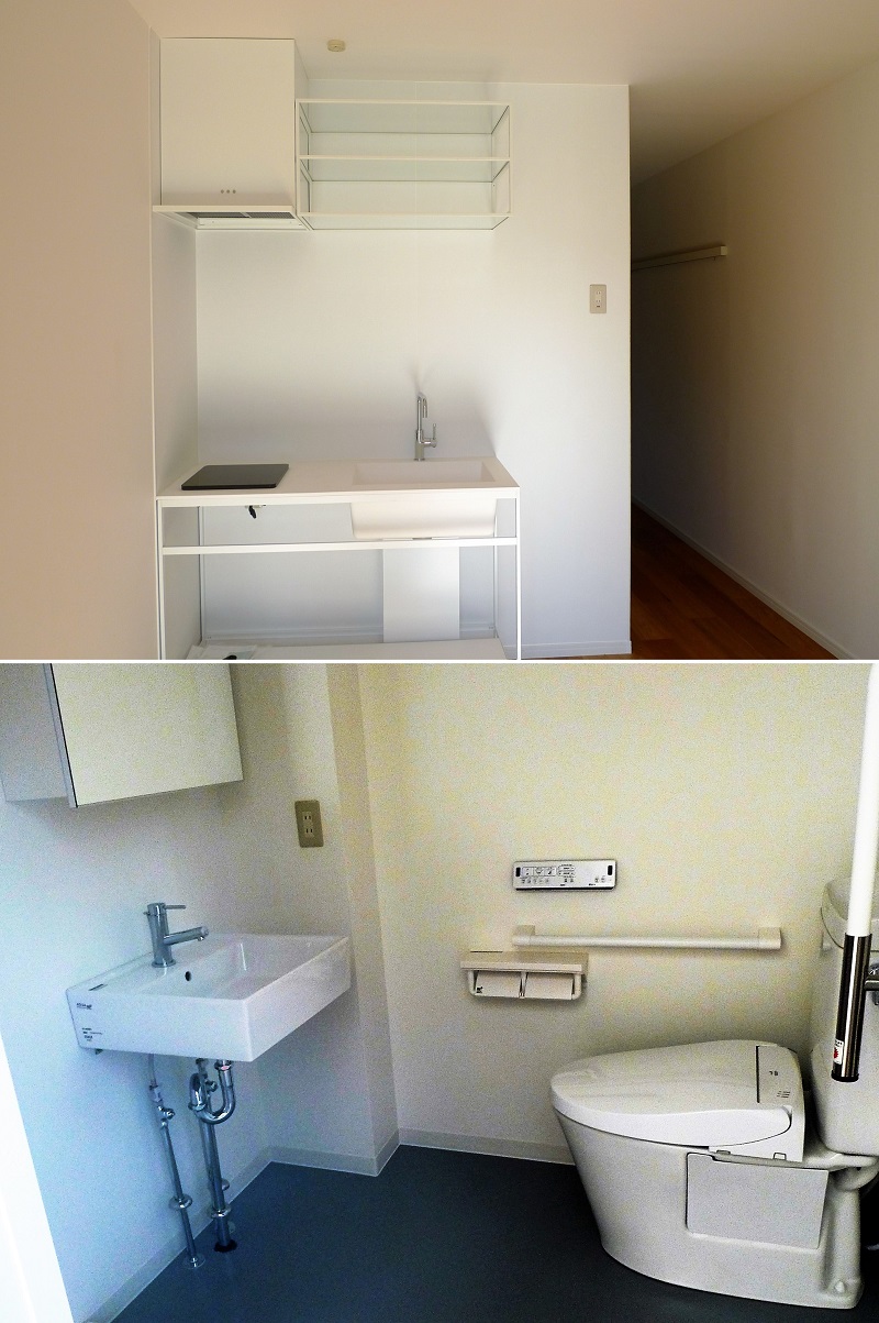 ノビシロハウスとして生まれ変わったアパートの1階の4室は高齢者向けで、2階の4室は一般向け。1階の居室は車椅子使用になったときも暮らしやすいようにと、玄関、廊下、水回りを広くしている。