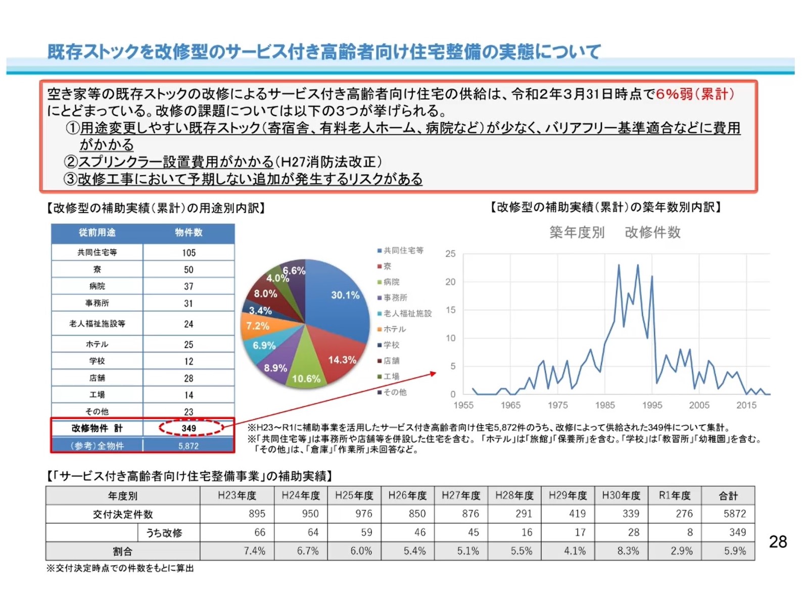 2021年度の事業では、既存ストックを改修する場合の補助限度額が、1戸あたり180万円から195万円に引き上げられた。反対に新築(25m2未満の住宅)の補助限度額は1戸あたり90万円が70万円に引き下げられた。既存ストックを改修したサ高住は、2020年3月末までの累計で6%弱にとどまっており、空き家などの遊休不動産の増加を背景に、今回の変更で既存ストックの活用を促進するねらいだ。