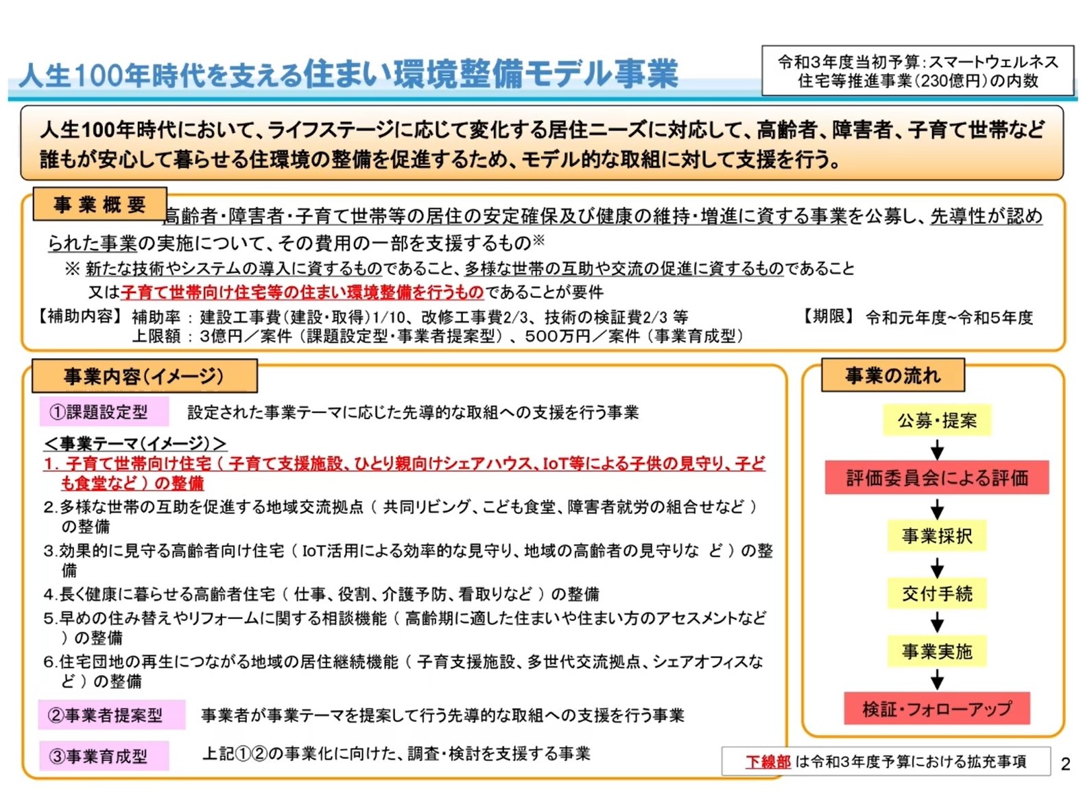 最後に、「人生100年時代を支える住まい環境整備モデル事業」について。これは、高齢者、障がい者、子育て世帯など誰もが安心して暮らせる住環境の整備を促進するために、先導的なモデル事業を公募し、採択された事業の費用の一部を支援するというもの。公募する事業には、課題設定型と事業者提案型がある。前者は国が設定した事業テーマに基づくもの。後者は事業者が独自の事業テーマを設けて行うものだ。これとは別に、事業育成型として、こうした事業の事前調査やニーズ調査なども支援の対象となっている。補助の上限額は、課題設定型や事業者提案型で、1案件につき3億円となっている。2021年度は、課題設定型として国が設定する事業テーマに、子育て世帯向け住宅の整備が追加された。課題に対してどのような事業が生まれてくるだろうか。