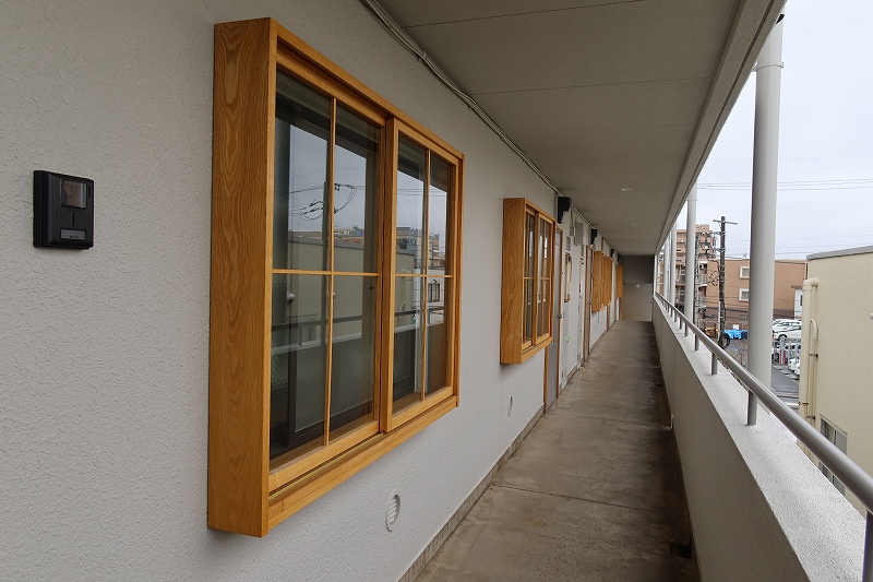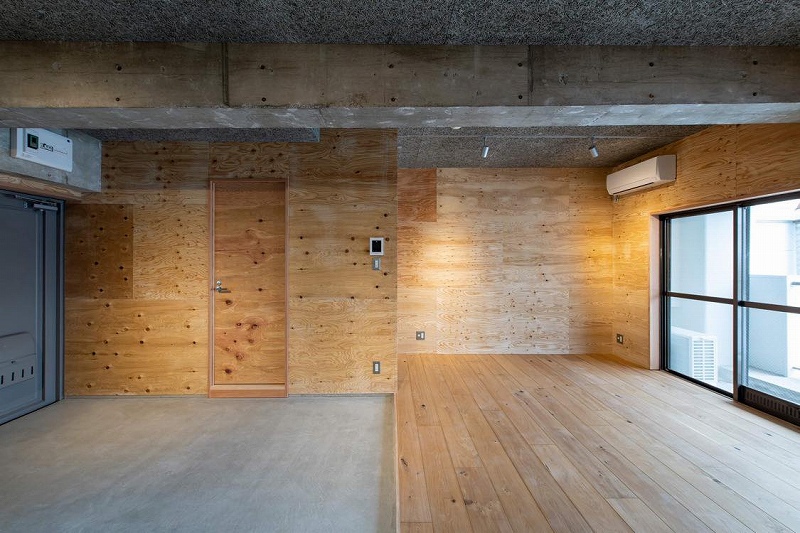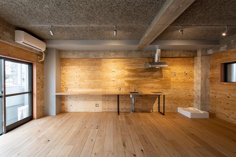 最後に2階の住居である。もともとは和室6畳2間の2Kで専有面積は広い部屋で37.5m2。それ以外は31.5m2、34m2とあり、いずれも改修で広いワンルームに。壁、床は無垢材を利用しており、広い土間がある部屋も。賃料は8万円~9万円(別途共益費)となっている。全体では10室あるものの、桃山建設社員、既存入居者がいる部屋があるため、募集したのは6戸(当初5戸だったが途中で空室が出て計6戸)。