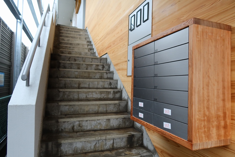 実際の空間を見ていこう。まずは階段状になったウッドデッキや壁などに使われた木と引き戸のガラス、そして建物を覆うように設置された鉄骨のグリッドが印象的な外観。建物は鉄筋コンクリート造の2階建てで、改装にあたって1階の店舗、共用部以外は配置なども含めて変わっていないのだが、建物は正面が変わるだけで印象が変わるものである。一見新築にも見える外観その他の空間デザインは株式会社Open Aが担当。灰色の愛想のない建物が並ぶ一角ではひときわ目を引く。