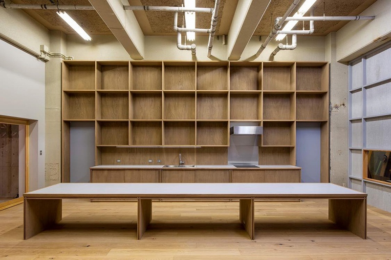 店舗スペースの間を抜けたところにあるのが入居者が使える共用スペースである。高い天井、壁一面の収納にシンプルなキッチン、5mもの長いテーブルが目につく広い空間で、入居者が好きに使えるスペースであり、DIYその他ものづくりに利用できる場でもある。